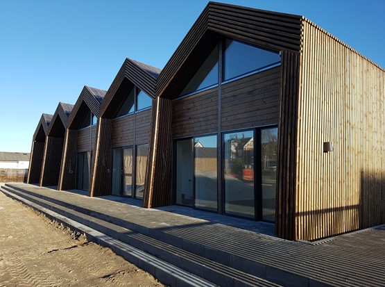 I 2018 lavede vi disse fem nye "kontrolleret skæve" huse på Havnepromenaden i Nyborg. Det var en anderledes udfordring, da næsten ingen spær var ens - men også et flot og anderledes resultat, som vi er stolte af. Husene indeholder tre klubhuse til henholdsvis Nyborg Motorbådsklub, Nyborg Småbådsklub og dykkerklubben, Moby Dick. Derudover er der et gæstehus til gæstesejlere og så Havnekontoret.